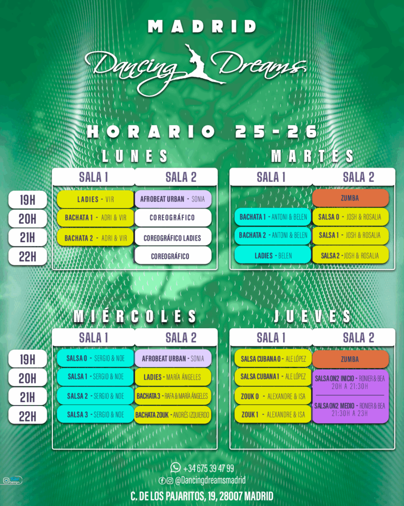 Horario 25-26 Horario de clases de baile de la escuela Dancing Dreams Madrid. Curso 2025/2026 Consulta nuestros horarios de clases de salsa, bachata, hip hop, zumba… Reserva tu clase